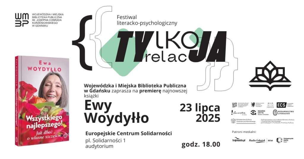 Wojewódzka i Miejska Biblioteka Publiczna w Gdańsku zaprasza na spotkanie autorskie z Ewą Woydyłło w związku z premierą książki „Wszystkiego najlepszego! Jak dbać o własne szczęście” w ramach festiwalu literacko-psychologicznego TYlko relacJA. Festiwal stworzony został jako odpowiedź na potrzeby wciąż zmieniającego się społeczeństwa. Skupia się na korelacji między indywidualnym dobrostanem (JA), a stanem tworzonych relacji (TY). Festiwal to cykliczne spotkania autorskie oraz pogłębiające pole widzenia warsztaty i prelekcje zachęcające do wspierania i budowania dobrostanu psychicznego, fizycznego oraz społecznego człowieka, promujące potrzebę rozwoju i samorealizacji. Wydarzenia w ramach festiwalu odbywają się od maja do listopada i zwieńczone zostaną finałem, który będzie mieć miejsce w dniach 19-23 listopada.